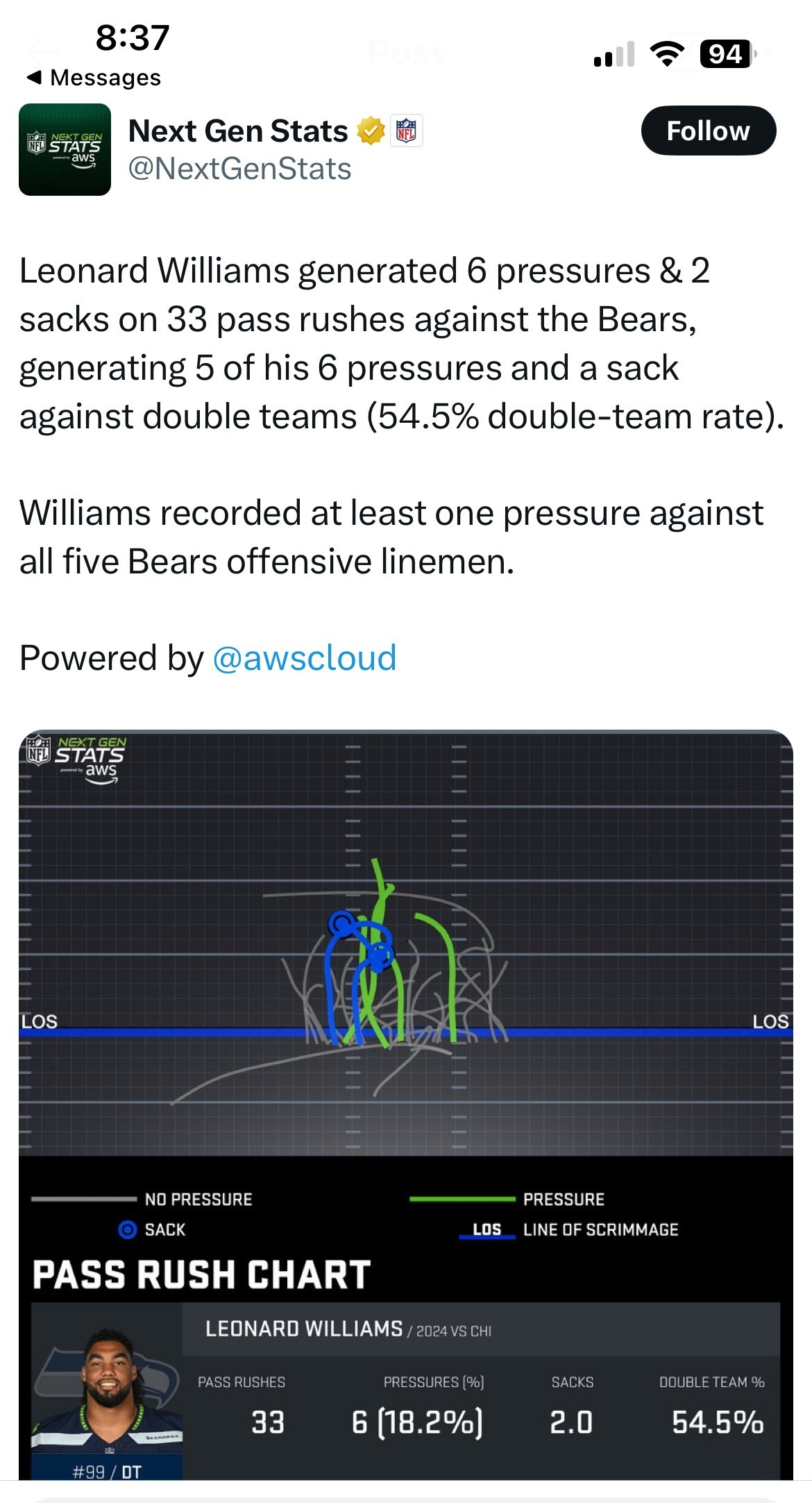 Anyone who reads SeaTown Sports’ Seahawks coverage or listens to our podcast knows that we love Leonard Williams. But how could you not? Williams recorded to top PFF grade for the Seahawks’ defense on Thursday with six quarterback pressures, two sacks and four total tackles. Even more impressive was his work against double teams.