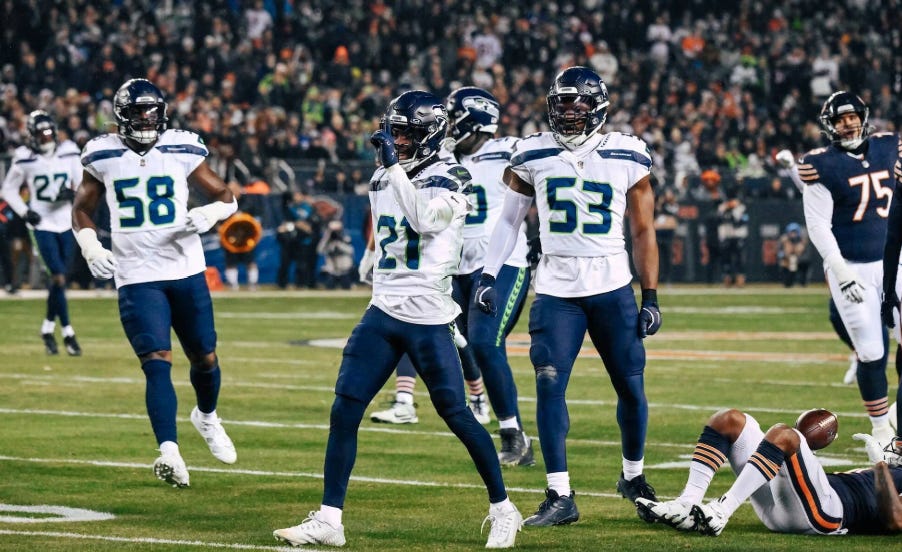 But Witherspoon does so much more. He had five tackles, including his first sack, against the Bears. He plays with ferocity and no fear. He provides a physicality that the Hawks lacked after the Legion of Boom left. Witherspoon has 74 tackles on the season and 35 “STOPs” (plays that constitute a failure by the opposing team). Both of those numbers rank first in the NFL among all cornerbacks. Lucky for Hawk fans, head coach Mike Macdonald recognizes Witherspoon’s awesomeness as well. Read more about Witherspoon’s impact here in John Boyle’s post.