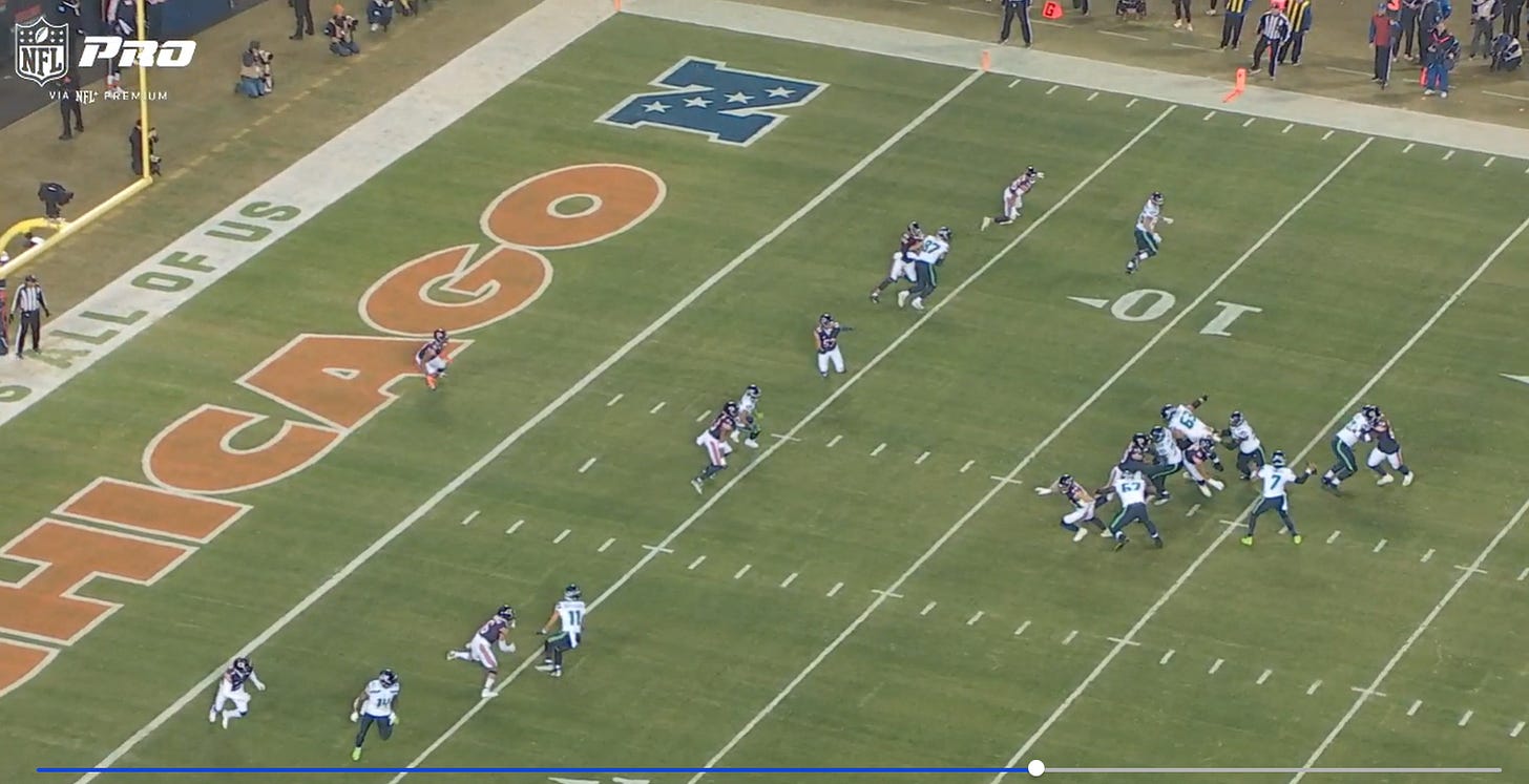 The inability to get the run game going after the first drive and the lack of creativity on offense in the passing game led to a putrid offensive performance against the Bears on Thursday night. While Grubb designed some great screen plays (specifically for Noah Fant), too many of his passing plays had receivers running at the same depth. If Chicago wanted to know that the Hawks would do on a 3rd and short play, just defend the sticks. Look at this play on the first drive when Seattle faced a 3rd and 3 in the red zone.
