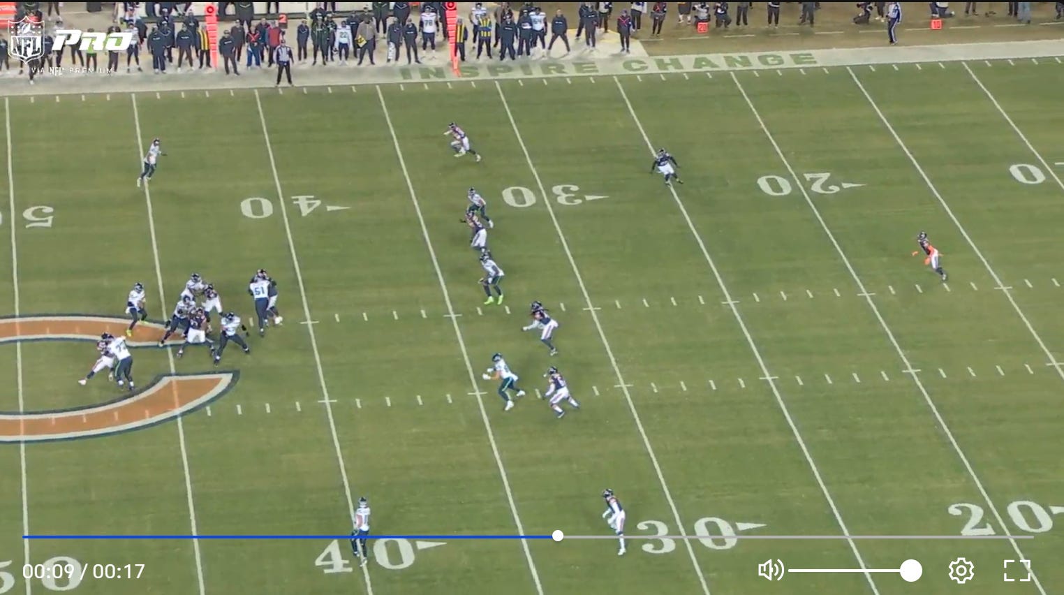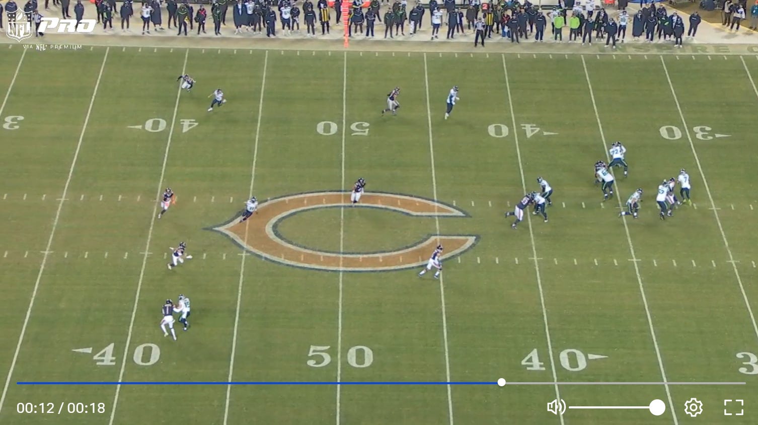 On this play, the Hawks have three receivers all at the 33 yard line and all about seven feet apart from each other. This plays right into the Bears hands as they can defend all three players with ease.