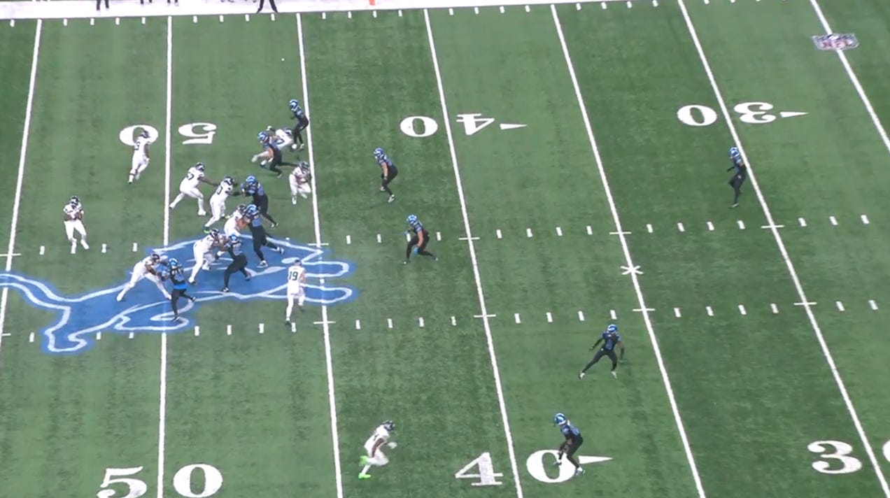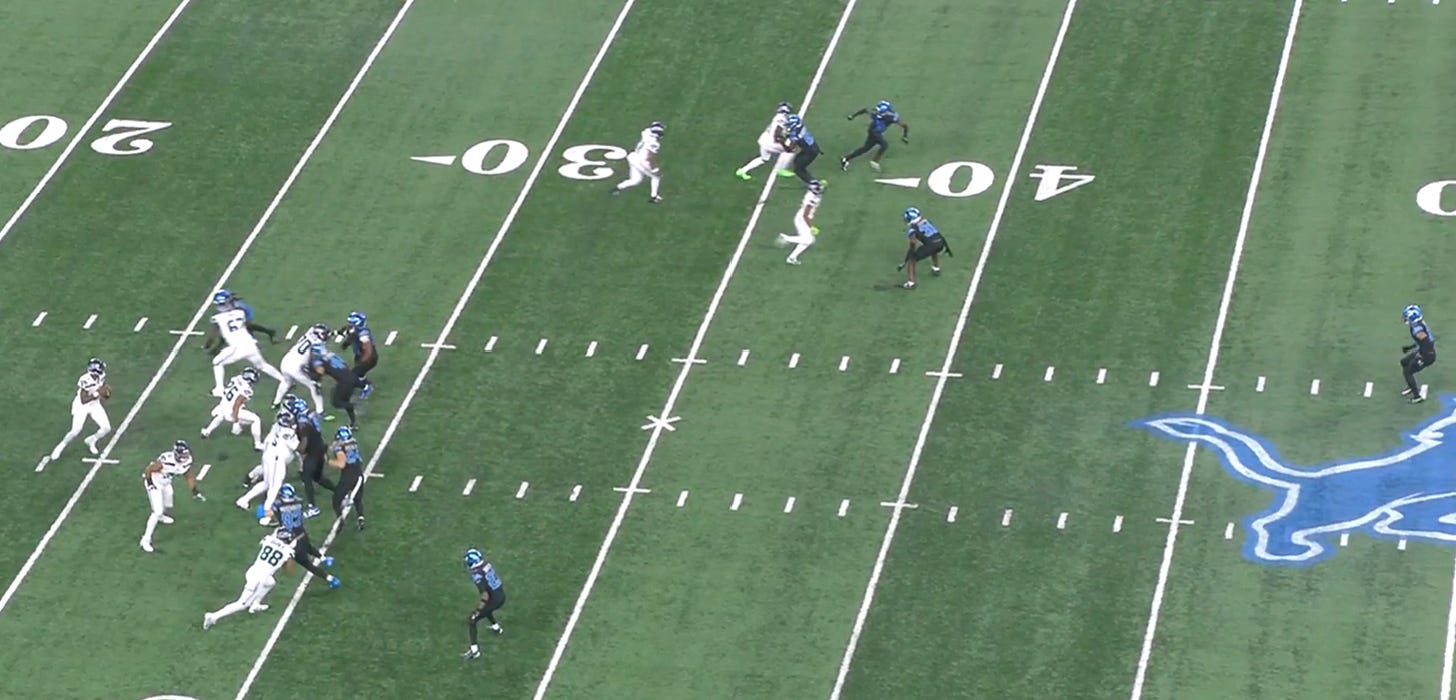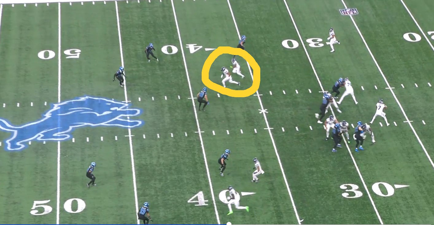 In this play below, DK Metcalf is running a rub route (similar to the one that Tyler Lockett was flagged on later). Jaxon Smith-Njigba is at the 33 yard line and about to turn toward the sideline. This was a great third down play call to get JSN open in space and get a first down. It only works if you study your opponent and know what you want to do against their tendencies. It is also creative because it is a play designed to be thrown before the first down marker, but with execution it becomes a first down.