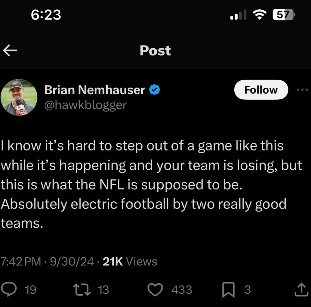 Hawkblogger nailed it. What a fun game. Maybe I enjoyed the game, despite the loss, because the Hawks were 3-0 coming in. Maybe I enjoyed it because I knew Seattle is playing the Giants this week (probably without Malik Nabers). But Monday Night was great. Lions offensive coordinator Ben Johnson called an absolutely perfect game and Ryan Grubb was with him nearly every step of the way. Geno Smith was electric, as were the skill position players for the Hawks. At the same time, this was a game that showed Hawks fans that Seattle has a ways to go to be elite. While the Seahawks battled through major injuries and weren’t at their best personnel wise, Seattle simply needs to be better.