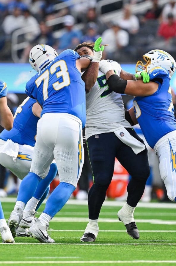In two series against the Chargers sans Justin Herbert, the starting defense forced two three-and-outs while holding the Bolts to just eight yards. The next two possessions, featuring the Hawks number two defense, had even more success with a forced punt and in interception by Coby Bryant. Maybe the best part of all was that Jim Harbaugh and the Chargers clearly wanted to establish the run and the Hawks wouldn’t let them. A far cry from the sieve of a run defense we saw in 2023.