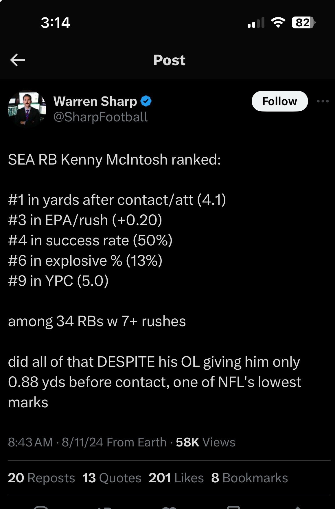 One of the most discussed players in camp has been undrafted running back George Holani of Boise State. Apparently Kenny McIntosh was listening to that discussion as well. With Kenneth Walker III and Zach Charbonnet locks for the roster, the competition for the third running back spot comes down to Holani and McIntosh. On Saturday, McIntosh answered the call with 40 yards on eight carries while looking explosive in the process. Look at this tweet by Warren Sharp on how good McIntosh was last weekend.