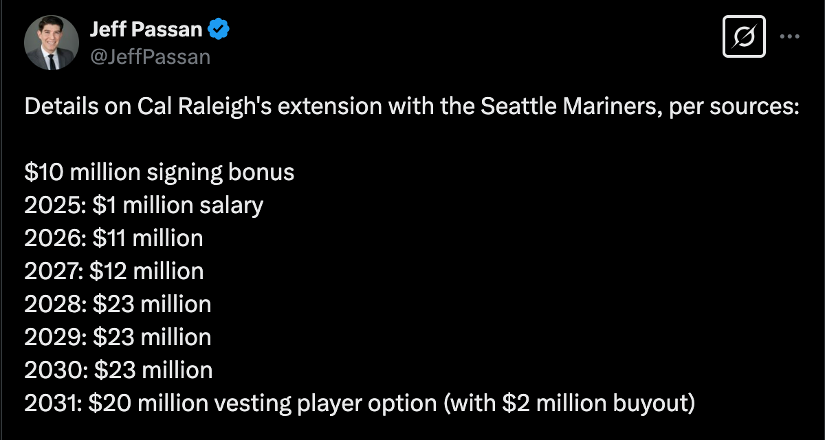 With Cal extended, the heart and soul of the Mariners remains intact for any season a fan could reasonably care about on the verge of Opening Day 2025. Not only do fans have yet another bankable star, alongside Julio, to consider “forever” Mariners, the key to the success of the pitching staff and the glue of the locker room is now firmly locked into place.