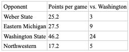 The Defense. I am trying to be realistic about how good this Huskies defense is, but week after week, opposing offenses are underperforming against the Huskies. Below is a table of Washington’s opponents and their average points per game this season, compared to the amount of points the Huskies surrendered to them in their games: