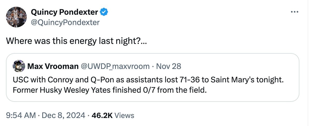 The Washington Huskies men’s basketball team is 7-3 with three more non-conference games before fully diving into Big Ten conference play. I say “fully diving” because the team has already dropped its first two conference games to UCLA and USC. The Huskies appeared competitive against No. 24 UCLA, only losing by 11 points, but then got slaughtered by unranked USC, 87-69. Husky legend and current USC assistant coach Quincy Pondexter wanted all the smoke on social media after the game:
