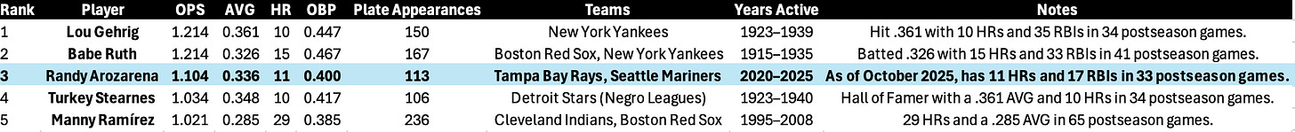That is not just impressive, it is historically elite. In fact, among players with at least 100 career postseason plate appearances, only Babe Ruth (1.214 OPS) and Lou Gehrig (1.214 OPS) have a higher OPS. That puts Arozarena in the same conversation as the all-time legends, while his performance in the modern era under high-pressure conditions arguably makes him the most dangerous playoff hitter of his generation.