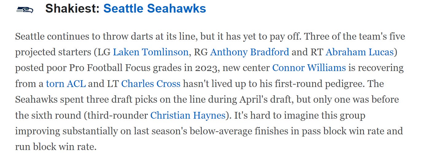Projected starters: Charles Cross (LT), Laken Tomlinson (LG), Connor Williams (C), Anthony Bradford (RG), Abe Lucas (RT)