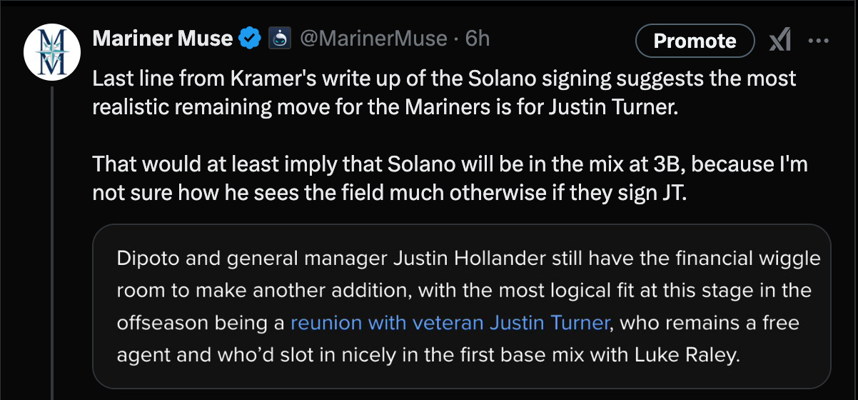 While Solano’s potential to be merely a 1B/DH makes the roster fit awkward, MLB.com’s Daniel Kramer suggested in his write up of the signing that the Mariners are still interested in bringing back 1B/DH Justin Turner. Turner, the other veteran option in the Santana mold, appears to be waiting out the market, and he made $13M last season and likely won’t be keen to leave home for much less.
