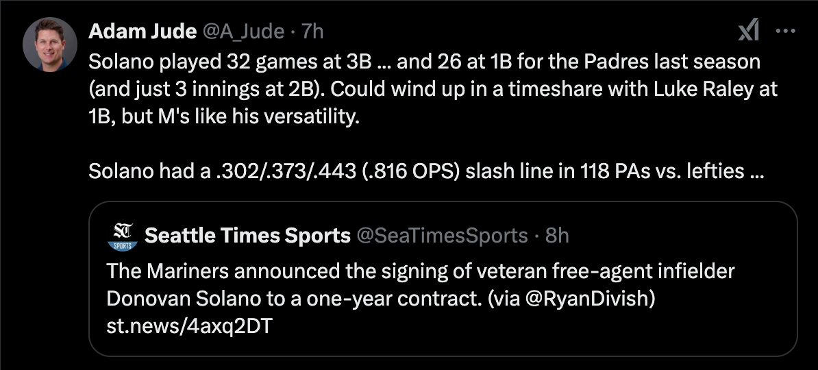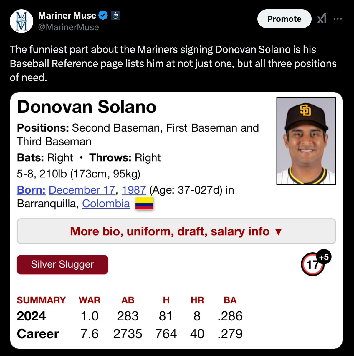 Where Solano fits into the Mariners’ overall plan for their 2025 roster remains a bit of a mystery. The Mariners have clear weaknesses and available playing time at 3B, 2B, right-handed 1B and DH. Solano’s Baseball Reference page, hilariously, lists him at all three of those infield positions, and he also spent significant time as a DH last year. Solano could potentially help with every major need the Mariners have, but he also can’t be cloned to fill them all, despite advances in modern science.