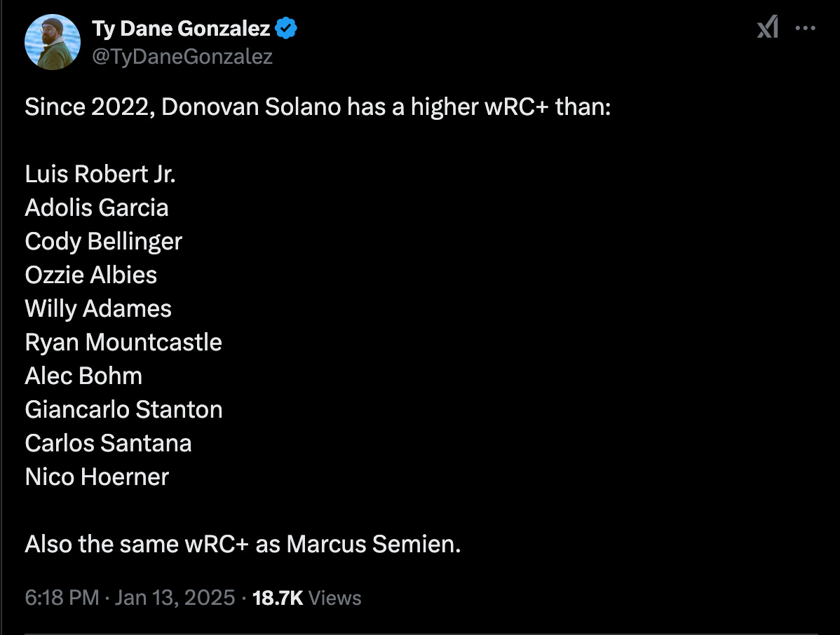 From 2019 through 2024, Solano posted a wRC+ between 99 and 125 in every season. After hitting .330 and .326 with the Giants in 2019 and 2020, Solano has hit between .280 and .286 for four different teams, two with extreme hitter’s parks in Cincinnati and Minnesota and two with some of the least friendly hitting environments in the league in San Francisco and San Diego.