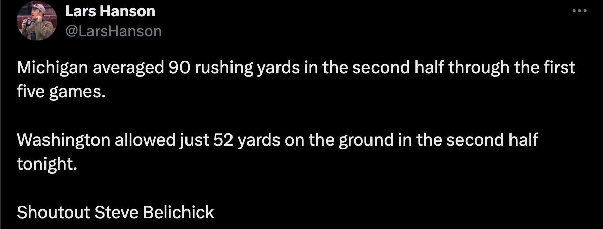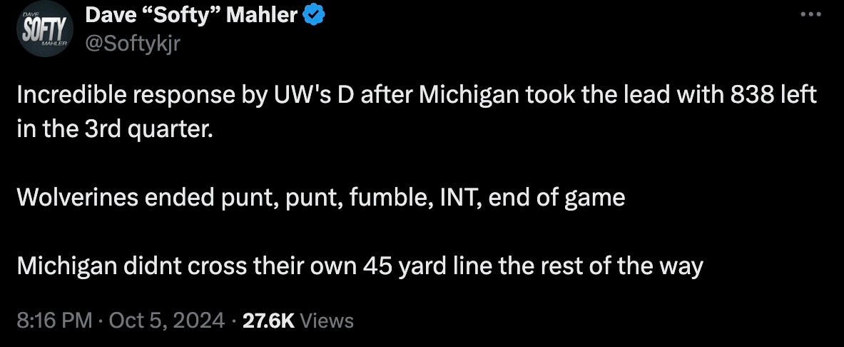 The Wide Receiver Room. How good are Denzel Boston and Giles Jackson? Good enough to combine for 158 yards and two touchdowns against an above-average Michigan secondary. Despite NFL prospect Will Johnson in coverage for the Wolverines, the Washington receiving room still found success. It is hard to believe that these two were in the same receiving room that had three NFL receivers last year. As opposing defenses have to game plan more and more against the duo, Rogers will have to rely on other pass catchers, including tight end Keleki Latu who quietly had his best game of the season, with seven receptions for 65 yards.